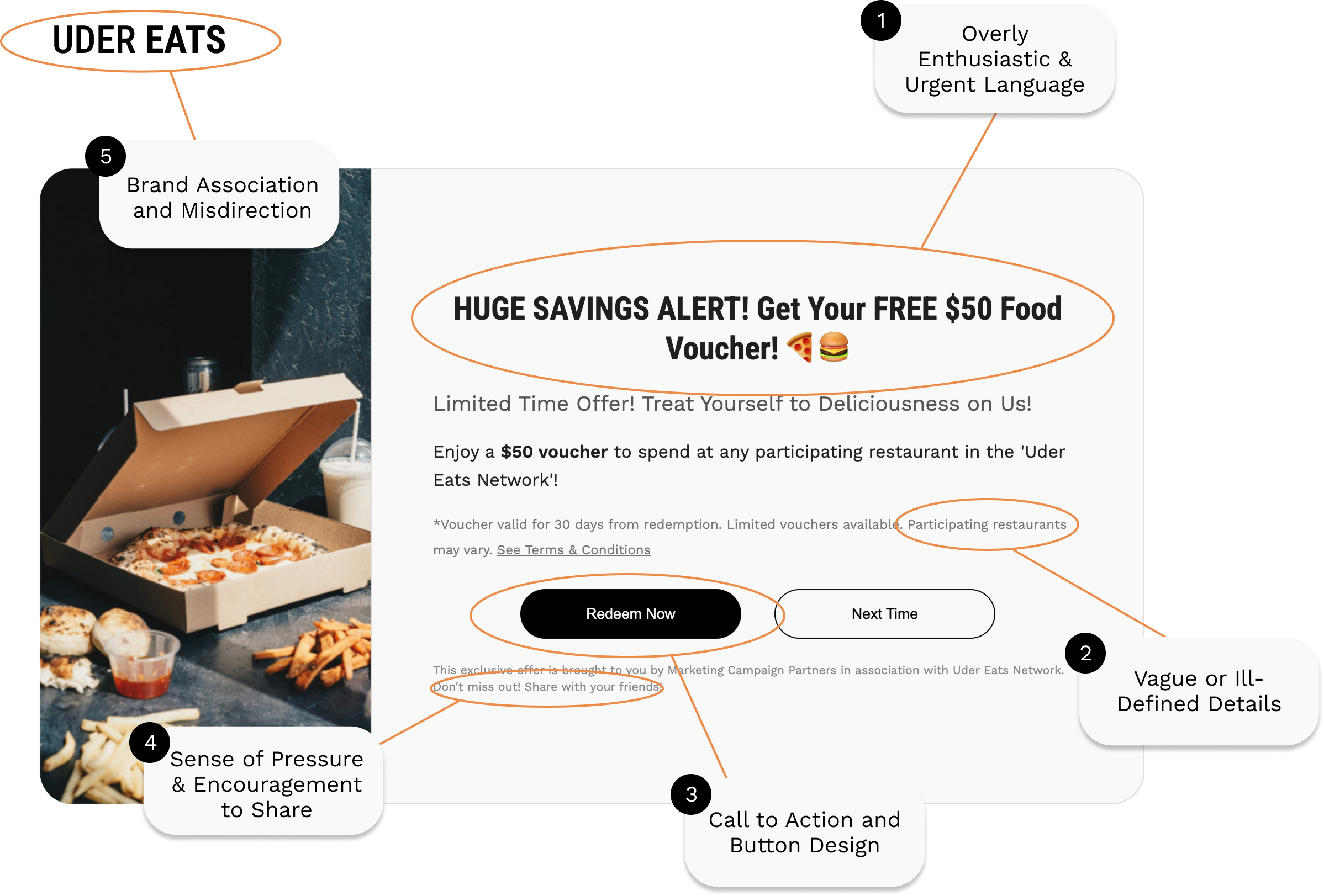 Having prominent buttons encourages immediate action, reducing the time for users to think critically. The 'Redeem Now' call to action is designed to capitalize on the excitement and perceived urgency.